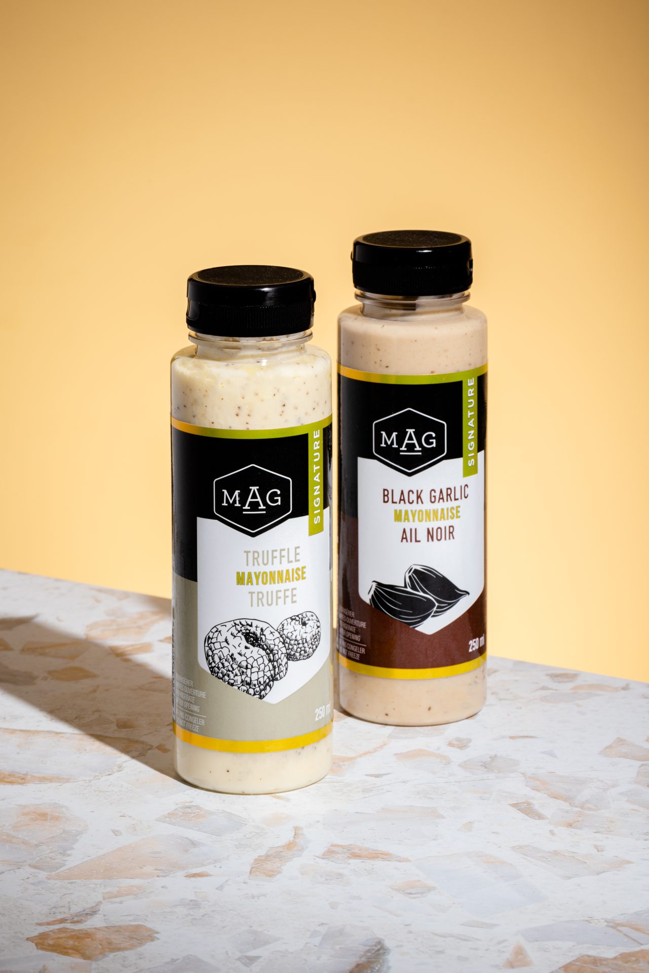 La gamme « Signature » offre deux saveurs de mayonnaises recherchées : mayonnaise truffle et mayonnaise ail noir. Ces deux produits se distinguent énormément du marché traditionnel de la mayonnaise par leurs saveurs complètement uniques et sophistiquées. Effectivement, les saveurs riches et profondes des produits apporteront assurément une touche de distinction à tes recettes!