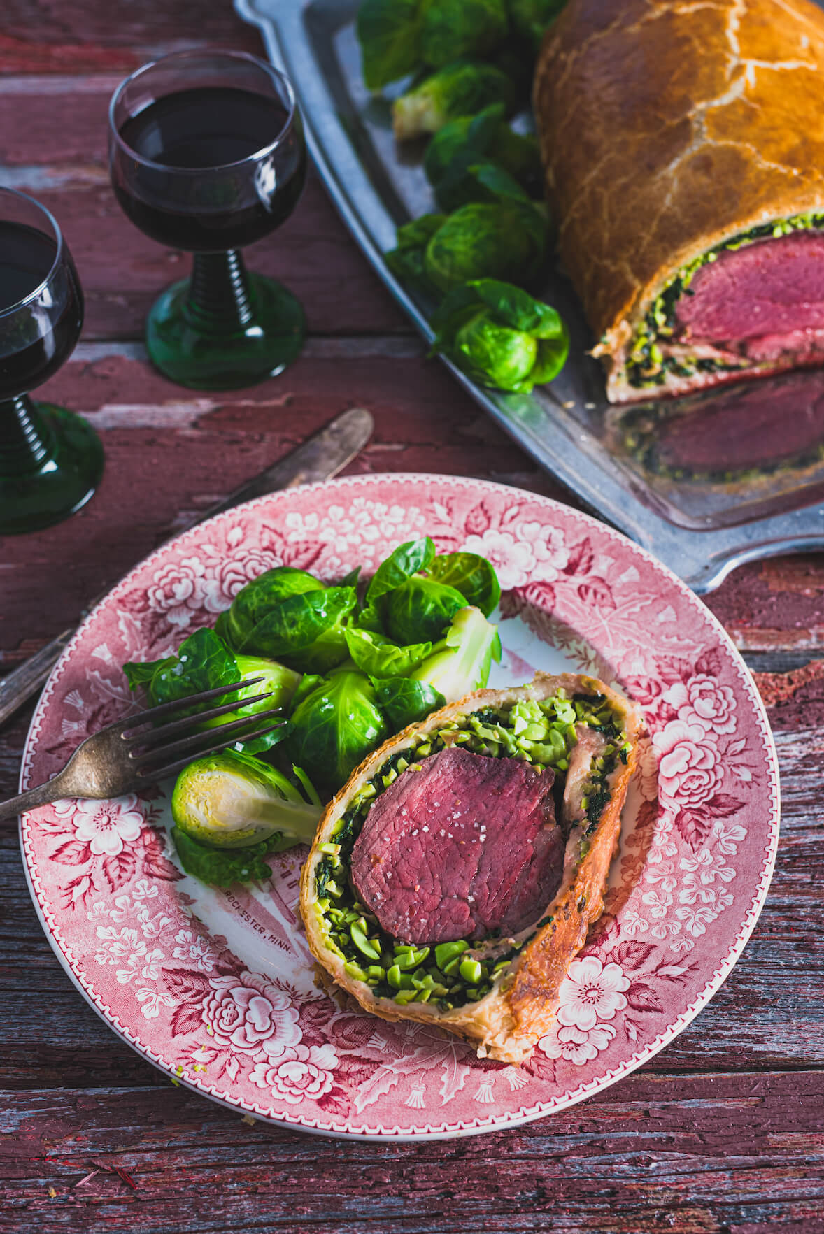 Home Recipes The best dinner party recipes Beef Wellington Close Avantages exclusifs Deviens membre BPT+ pour ajouter une recette en favori et profiter d'une foule d'autres avantages! Deviens membre BPT+ Beef Wellington Quick access Ingredients Preparation Comments Ingredients Preparation Comments By: Hubert Cormier, Ph.D., docteur en nutrition Preparation 20 min Cooking 40 to 45 min Refrigeration 0 min Freezing 0 min 10 servings Tough nut to crack (hard) Quick access Ingredients Preparation Comments Ingredients Preparation Comments Dietary restrictions Categories Main dishes Like it? Share it! Beef Wellington The Best Beef Wellington This modernized classic beef Wellington recipe is delectable! Although red meat is quite expensive, especially filet mignon cuts, this dish makes it well worth the price. Far from a vegetarian meal, beef Wellington is however sure to please the carnivores. We added edamames and spinach to create a beautiful contrast with the red center. We present you BPT’s mouthwatering Quebec-style beef Wellington recipe! Psst! Lack time to make dinner? Prepare this easy slow cooker orange beef instead! SIMPLY DELICIOUS: Make these recipes to serve with your beef Wellington! Cauliflower rice Beet Salad Brussels Sprout Salad Like it? Share it! Bonà savoir Try different meats! Inspire yourself from this beef Wellington recipe to create variations. For example, you could use chicken breast, salmon filet, or pork tenderloin instead of filet mignon. Plus, these options are less expensive. Ingredients Switch to cook mode Metric Imperial Beef Wellington Butter - 2 tablespoons 30 mL To discover! Oil - 3 tablespoons 45 mL To discover! Beef filet mignon - 1.5 kg 1.5 kg To discover! Salt and pepper - To taste To taste To discover! Frozen spinach, thawed and drained - ¾ cup 180 mL To discover! Edamames, chopped - ½ cup 125 mL To discover! French shallots, finely chopped - 3 to 4 units 3 to 4 units To discover! Parsley, chopped - ¼ cup 60 mL To discover! Puff pastry - 1 kg 1 kg To discover! Beaten egg - 1 1 To discover! Preparation Switch to cook mode Beef Wellington Step 1 In a large pan, heat the oil and butter. Step 2 Brown the beef on all sides. Season with salt and pepper. Set aside until completely chilled. Step 3 In a large bowl, mix together the spinach, edamames, French shallots, and parsley. Set aside. Step 4 Preheat the oven to 200 °C (400 °F). Step 5 Flour a work surface and roll out the puff pastry in a 23 x 16 inches (50 x 35 cm) rectangle. Cut four 2 x 2 inches (5 x 5 cm) squares of dough in each corner so that there is only a cross left. Step 6 Spread the filling in the middle of the dough, then place the chilled meat on top. Step 7 Wrap the dough around the beef, bringing the edges back underneath the meat and press to seal. Step 8 Place on a baking sheet lined with parchment paper. Step 9 Brush the puff pastry with the beaten egg. Step 10 Cook in the oven for 40 to 45 minutes, or 1 hour for medium doneness. Step 11 Remove from the oven. Let stand for 10 minutes before serving. Like it? Share it!