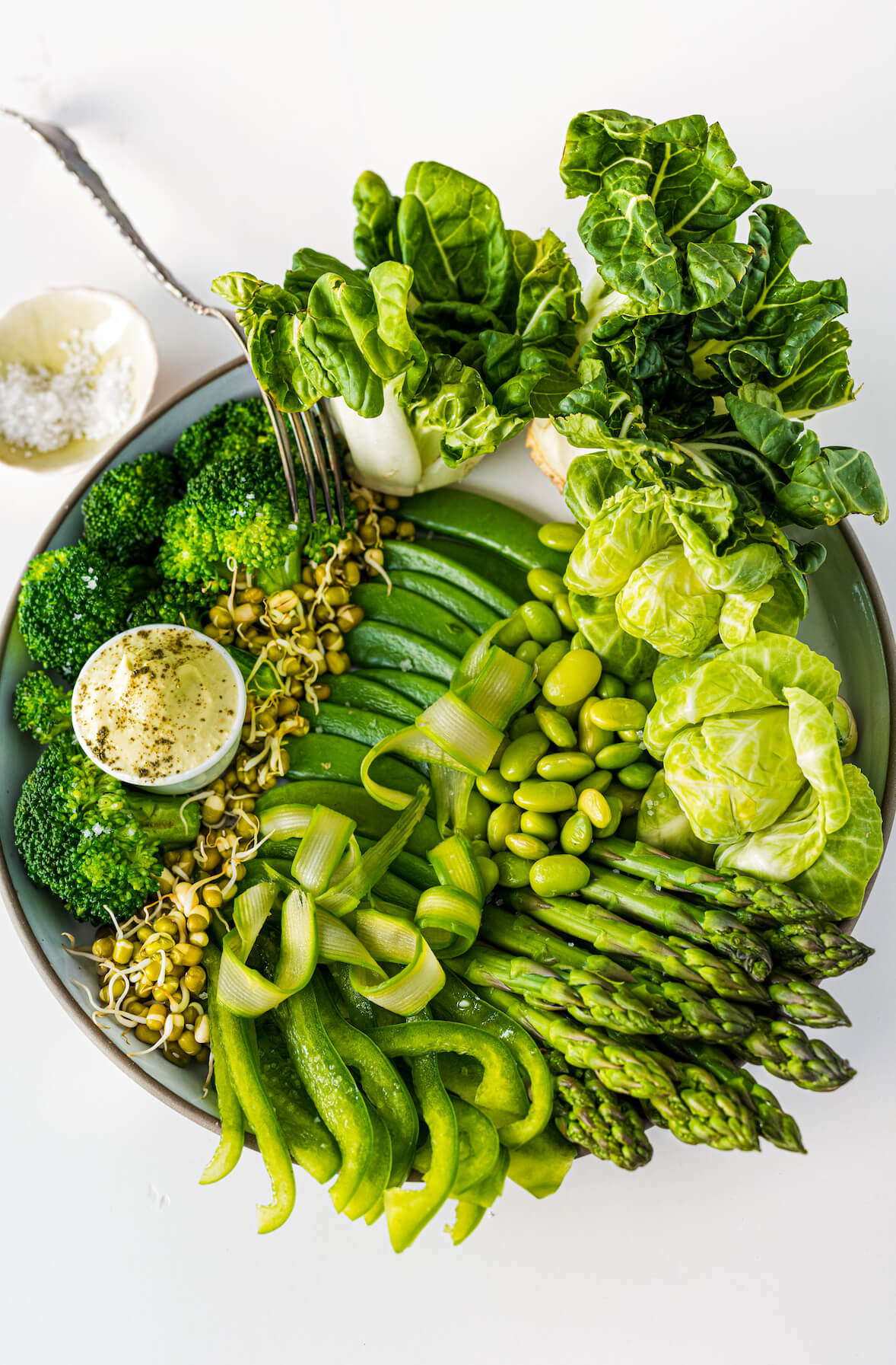 Home Recipes Peanut-free Green Salad Close Avantages exclusifs Deviens membre BPT+ pour ajouter une recette en favori et profiter d'une foule d'autres avantages! Deviens membre BPT+ Green Salad Quick access Ingredients Preparation Comments Ingredients Preparation Comments By: Hubert Cormier, Ph.D., docteur en nutrition Preparation 10 min Cooking - Refrigeration 0 min Freezing 0 min 4 servings Piece of cake (easy) Quick access Ingredients Preparation Comments Ingredients Preparation Comments Dietary restrictions Categories Main dishes Salad meals Like it? Share it! Green Salad The Best Green Salad! Green is the colour of health! Indeed, green vegetables are often said to boost the vitamin and mineral intakes. It’s totally true! Plus, these vegetables are delicious. This healthy salad combines different textures, shades, and flavours, to your eyes and tastebuds’ delight! This salad can very well be made in advance. Simply make sure to store the dressing seperatly and only mix it when ready to serve. Enjoy! SIMPLY DELICIOUS: Is green your favourite colour? Try this green apple and spinach juice, this green pineapple smoothie, this vitamin-rich green meal bowl, this green shakshouka, or these green pancakes! Like it? Share it! Bonà savoir Don't throw away the broccoli stem! Don’t throw away the stem of your broccoli! You can easily grate it and incorporate into a salad or falafel recipe! You can even use it in a green smoothie. Ingredients Switch to cook mode Metric Imperial Dressing Cashew nuts, previously soaked in water for at least 4 hours - ¼ cup 60 mL To discover! Avocado - ½ 1/2 ½ To discover! Almond beverage - ½ cup 125 mL To discover! Plain Greek yogurt - ¼ cup 125 mL To discover! Nutritional yeast or grated parmesan - 1 tablespoon 15 mL To discover! Green matcha tea - ½ teaspoon 2.5 mL To discover! Green salad Mini bok choy - 8 8 To discover! Brussels sprouts - 8 8 To discover! Asparagus - 40 40 To discover! Green bell pepper, cut into strips - 1 1 To discover! Broccoli, in florets - 1 1 To discover! Sweet peas - 1 cup 250 mL To discover! Soy bean sprouts - To taste To taste To discover! Edamames - 1 cup 250 mL To discover! Preparation Switch to cook mode Green salad Step 1 Place all the dressing ingredients in a food processor and puree until smooth. Step 2 In a large pan, bring water to a boil. Blanch the vegetables a few seconds. Step 3 Place the vegetables into a bowl filled with ice-cold water, then drain. Step 4 Carefully prepare salad plates and drizzle the dressing on top. Like it? Share it!
