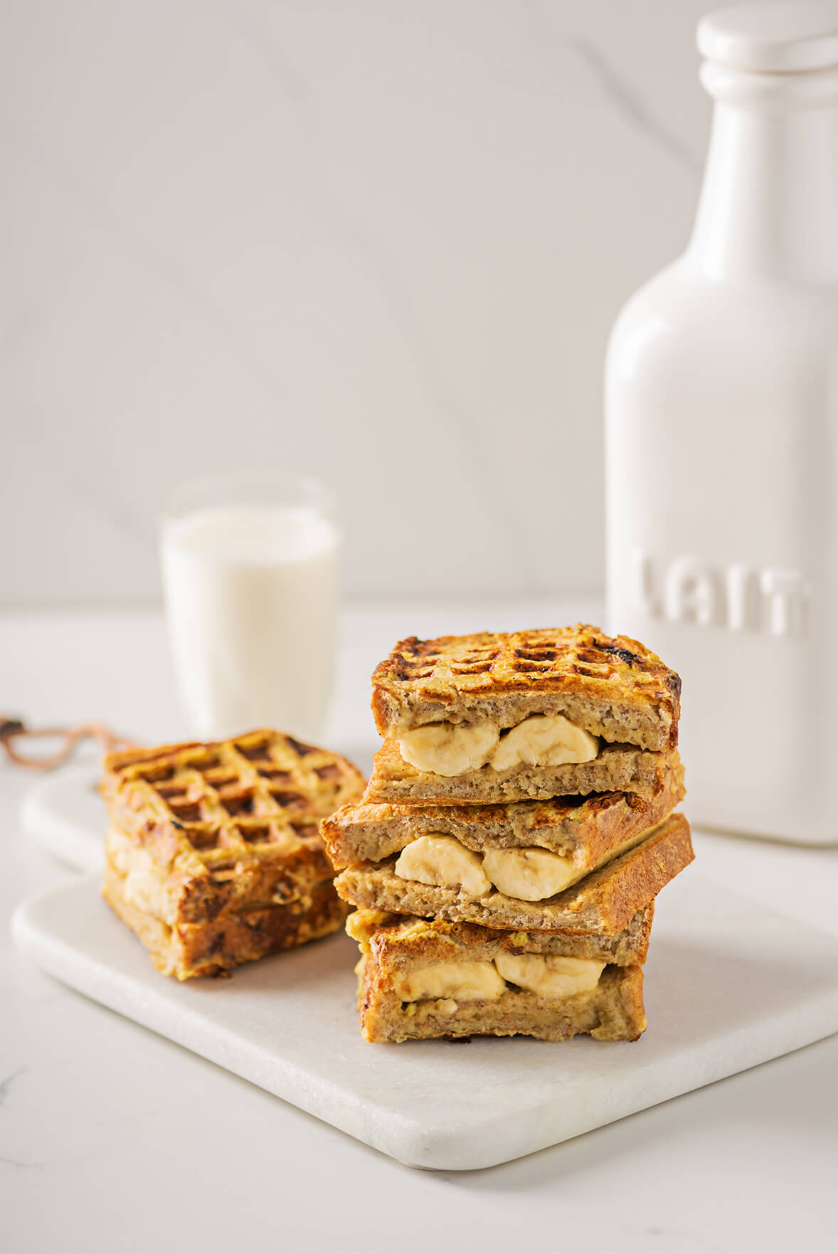 Home Recipes Breakfasts Grilled Banana French Toast Sandwich Close Avantages exclusifs Deviens membre BPT+ pour ajouter une recette en favori et profiter d'une foule d'autres avantages! Deviens membre BPT+ Grilled Banana French Toast Sandwich Quick access Ingredients Preparation Comments Ingredients Preparation Comments By: Hubert Cormier, Ph.D., docteur en nutrition Preparation 15 min Cooking 20 min Refrigeration 0 min Freezing 0 min 4 servings Piece of cake (easy) Quick access Ingredients Preparation Comments Ingredients Preparation Comments Dietary restrictions Categories Breakfasts Like it? Share it! Grilled Banana French Toast Sandwich The Best Nutritious Sweet Sandwich Feel like eating french toasts, but don’t really have time to make them? Here is a grilled banana french toast sandwich that is super nutritious and quick to make. It’s perfect for athletes on the go! Since bananas and chocolate are a classic combo, why not add a chocolate touch to your breakfast sandwich? SIMPLY DELICIOUS: Prefer salty breakfasts? Try this breakfast sandwich. Like it? Share it! Bonà savoir Caramelize your bananas! For those mornings where you have more time, you could sprinkle brown sugar on your bananas and caramelize them in a non-stick pan over medium heat. Then, add them to your sandwiches for a more decadent version! It’s simply delicious! Ingredients Switch to cook mode Metric Imperial Large eggs - 6 6 To discover! 2% M.F. milk - 1 cup 250 mL To discover! Freshly squeezed orange juice - ¼ cup 60 mL To discover! Vanilla extract - 1 teaspoon 5 mL To discover! Brown sugar - 1 tablespoon 15 mL To discover! Ground cinnamon - 1 teaspoon 5 mL To discover! Ground nutmeg - A pinch A pinch To discover! Multigrain bread slices - 8 8 To discover! Vegetable oil - 1 tablespoon 15 mL To discover! Ripe bananas, cut lengthwise - 2 2 To discover! Preparation Switch to cook mode Step 1 In a large bowl, whisk together the eggs, milk, orange juice, vanilla, brown sugar, cinnamon, and nutmeg. Step 2 Dip the bread slices in the bowl, 2 at a time, and let them soak in the egg mix for 2 minutes. Step 3 Place a slice of bread in an oiled waffle maker. Add ½ a banana and cover with another slice of bread. Cook 2 minutes or until the sandwich is golden. Step 4 Repeat these steps for the 3 other sandwiches. Like it? Share it!