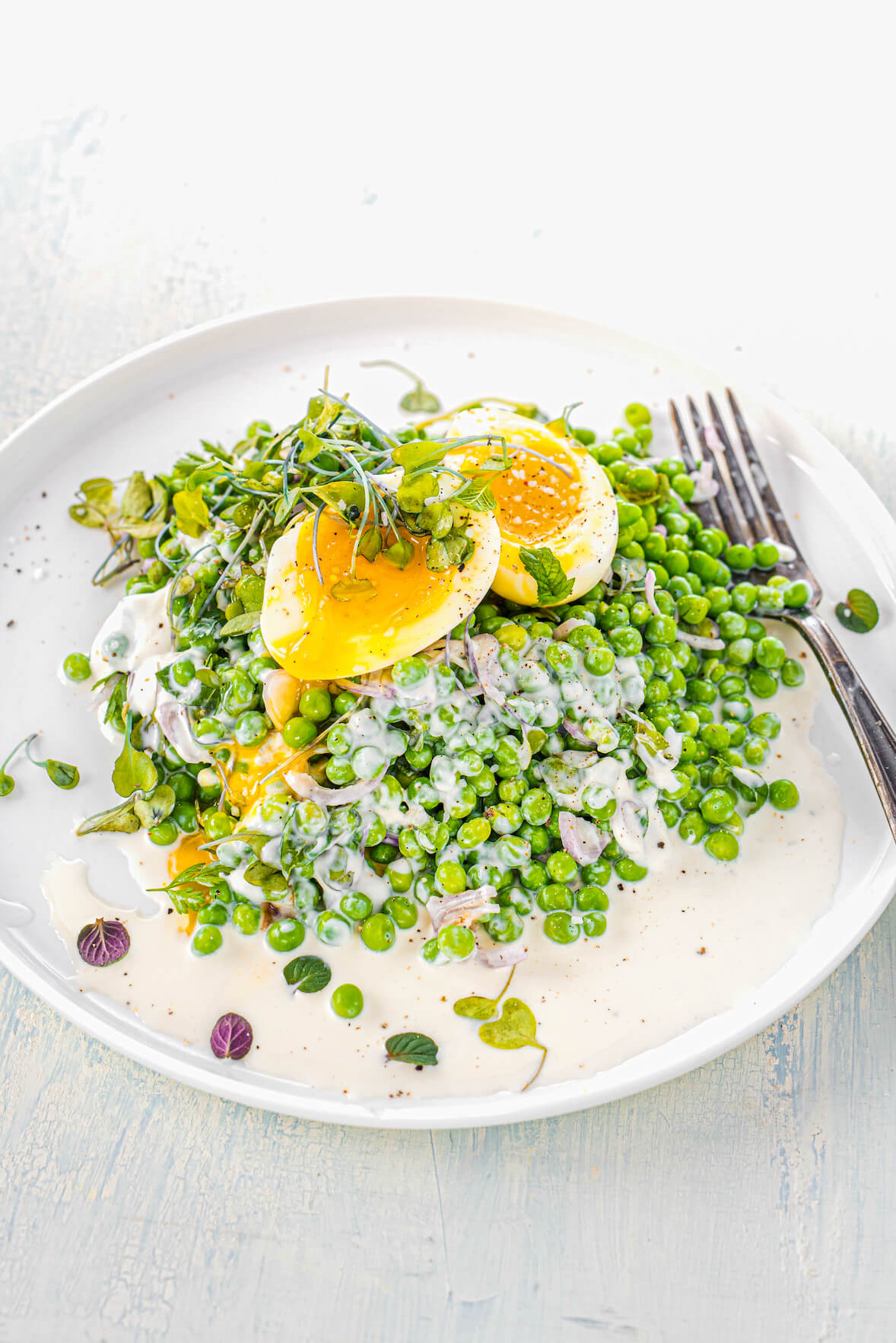 Home Recipes Breakfasts Soft Boiled Eggs on a Green Pea Salad Close Avantages exclusifs Deviens membre BPT+ pour ajouter une recette en favori et profiter d'une foule d'autres avantages! Deviens membre BPT+ Soft Boiled Eggs on a Green Pea Salad Quick access Ingredients Preparation Comments Ingredients Preparation Comments By: Hubert Cormier, Ph.D., docteur en nutrition Preparation 20 min Cooking 5 min Refrigeration 0 min Freezing 0 min 2 servings Piece of cake (easy) Quick access Ingredients Preparation Comments Ingredients Preparation Comments Dietary restrictions Categories Breakfasts Like it? Share it! Soft Boiled Eggs on a Green Pea Salad Green Salad Filled with Vitamins Why not create a recipe with the unusual soft boiled egg and green pea combo? Green peas are not always popular… Perhaps because they are mostly found canned or frozen? Yet, these green vegetables have great qualities: they are economical, delicious, as well as rich in fibers, vitamin C, and vitamin K. Because of its simplicity and exquisite taste, this salad recipe with soft boiled eggs is one of my favourites! SIMPLY DELICIOUS: Want to successfully cook your green peas each time? Learn how to cook frozen green peas! Like it? Share it! Bonà savoir Soft boiled egg substitute To make it easier to incorporate in a lunch box, simply substitute the soft boiled eggs with hard boiled eggs. Ingredients Switch to cook mode Metric Imperial Knob of butter - 1 1 To discover! French shallots, chopped - 2 2 To discover! Garlic cloves, pureed - 4 4 To discover! Frozen green peas, thawed - 3 cups 750 mL To discover! Plain Greek yogurt - ⅓ cup 75 mL To discover! 15% M.F. table cream - ⅓ cup 75 mL To discover! Rice vinegar - 2 tablespoons 30 mL To discover! Eggs - 4 4 To discover! Salt - A pinch 1 mL To discover! White vinegar - To taste To taste To discover! Mint - To taste To taste To discover! Microgreens - To taste To taste To discover! Salt and pepper - To taste To taste To discover! Preparation Switch to cook mode Step 1 In a non-stick pan, brown the French shallots in butter over medium heat. Add the garlic puree and remove from heat. Step 2 In a large bowl, mix the peas with the shallot and garlic preparation. Step 3 Add the yogurt, cream, and rice vinegar. Set aside. Step 4 In a pot, bring water with a pinch of salt and a bit of white vinegar to a boil. The volume of water most completely cover the eggs. Step 5 Once the water boils, delicately add the eggs. For a perfectly soft boiled egg, do not cook more than 6 minutes. Step 6 Rinse the eggs under cold water before peeling them. Lightly roll the eggs on a work surface to loosen the shell, then remove it slowly under cold water. Step 7 Cut the soft boiled eggs in halves and add on top of the green pea salad. Step 8 Garnish with mint leaves and microgreens. Step 9 Finally, season to taste. Like it? Share it!