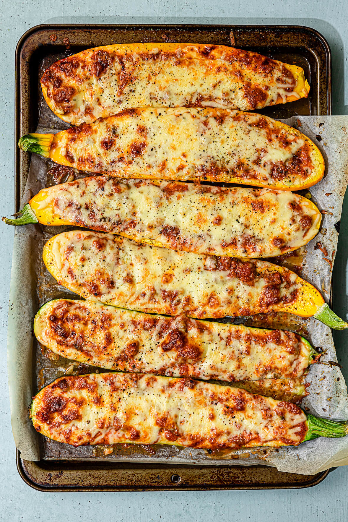 Home Recipes The best comfort food recipes Stuffed Zucchinis Close Avantages exclusifs Deviens membre BPT+ pour ajouter une recette en favori et profiter d'une foule d'autres avantages! Deviens membre BPT+ Stuffed Zucchinis Quick access Ingredients Preparation Comments Ingredients Preparation Comments By: Pamela Rousseau, Dt.P., Nutritionniste Preparation 15 min Cooking 25 min Refrigeration 0 min Freezing 0 min 4 servings Piece of cake (easy) Quick access Ingredients Preparation Comments Ingredients Preparation Comments Dietary restrictions Categories Main dishes Like it? Share it! Stuffed Zucchinis Easy Zucchinis Stuffed With Spaghetti Sauce What’s more comforting than a delicious recipe of stuffed zucchinis? With its tasty spaghetti sauce, appetizing melted cheese, and perfectly cooked zucchinis, this recipe will surely be a hit! Plus, if you already have sauce in the freezer, these stuffed zucchinis are super quick to make. Make this brussels sprouts salad with caesar dressing as a side. It goes perfectly well with this recipe! What to do with the zucchini leftovers? Don’t throw the leftovers in the garbage or compost! You can use them in these ultra-soft zucchini and chocolate muffins or in this zucchini and sweet potato soufflé. You could also make a soup or cream that incorporates them! SIMPLY DELICIOUS: Use the best spaghetti sauce to make your stuffed zucchinis! It has meat and lentils, as well as many vegetables. Like it? Share it! Bonà savoir How to perfectly brown your zucchinis To give a beautiful colour to your zucchinis, finish cooking using the broiler! This way, the cheese will be even tastier and golden. That being said, watch carefully your zucchinis. Indeed, when cooking at broil, your food can easily burn! Ingredients Switch to cook mode Metric Imperial Stuffed zucchinis Zucchinis, cut in half lengthwise - 2 big or 4 small 2 big or 4 small To discover! Homemade or shop-bought spaghetti sauce - 1 ¼ cup 310 mL To discover! Mozzarella cheese, grated - 1 cup 250 mL To discover! Parmesan cheese, grated - Au goût To taste Au goût To taste To discover! Salt and pepper - Au goût To taste Au goût To taste To discover! Olive oil - 1 tablespoon 15 mL To discover! Preparation Switch to cook mode Stuffed zucchinis Step 1 Preheat the oven to 400 °F (230 °C). Line a baking sheet with a silicone baking mat or parchment paper. Step 2 With a small spoon, scrape the inside of the zucchini halves to create a cavity on the length. Keep that part for another use. Step 3 Put mozzarella cheese in each zucchini. Next, put spaghetti sauce on top and then mozzarella cheese again. Sprinkle with parmesan cheese. Season with salt and pepper. Step 4 Place the stuffed zucchini halves on the baking sheet. Drizzle olive oil over them. Cook in the oven for 25 minutes. Like it? Share it!