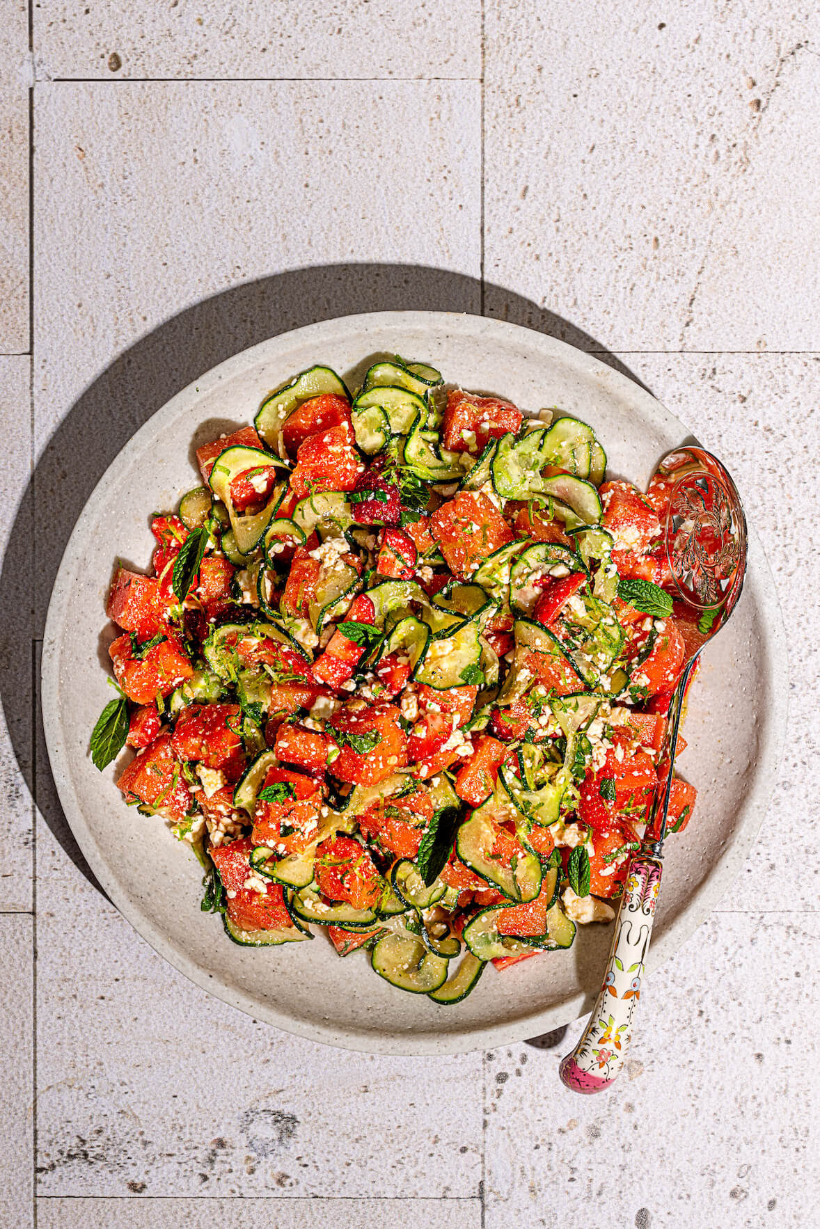 Home Recipes Gluten-free Watermelon and Feta Cheese Salad Close Avantages exclusifs Deviens membre BPT+ pour ajouter une recette en favori et profiter d'une foule d'autres avantages! Deviens membre BPT+ Watermelon and Feta Cheese Salad Quick access Ingredients Preparation Comments Ingredients Preparation Comments By: Pamela Rousseau, Dt.P., Nutritionniste Preparation 15 min Cooking - Refrigeration 0 min Freezing 0 min 4 servings Piece of cake (easy) Quick access Ingredients Preparation Comments Ingredients Preparation Comments Dietary restrictions Categories Like it? Share it! Watermelon and Feta Cheese Salad A Refreshing Watermelon and Feta Cheese Salad! Looking for a quick, light, and refreshing recipe? This watermelon and feta cheese salad is the perfect solution for you! With its sweet and salty flavours, this irresistible watermelon salad suits all tastes. Plus, did you know you could make this recipe with yellow watermelon? Indeed, the taste of yellow watermelon is quite similar to that of a regular one. SIMPLY DELICIOUS: Got leftover watermelon? Use it to make a watermelon lemonade or a homemade watermelon slush! Like it? Share it! Bonà savoir Feta cheese substitute Not really a fan of feta cheese? You can simply substitute it with bocconcini pearls! Indeed, watermelon goes wonderfully well with many types of cheeses. Besides, discover how to use the entirety of your watermelon, including the flesh, peel, and even the seeds! Ingredients Switch to cook mode Metric Imperial Watermelon and feta cheese salad Lebanese cucumbers, in slices or spirals - 2 cups 500 mL To discover! Watermelon, diced - 2 cups 500 mL To discover! Strawberries, sliced - 1 ½ cup 375 mL To discover! Feta cheese, crumbled - 1 cup 250 mL To discover! Mint, chopped - 3 tablespoons 45 mL To discover! Dressing Extra virgin olive oil - 2 tablespoons 30 mL To discover! Maple syrup - 2 tablespoons 30 mL To discover! Lime juice - 1 tablespoon 15 mL To discover! Lime zest - 1 teaspoon 5 mL To discover! Mint, chopped - 1 teaspoon 5 mL To discover! Kosher salt - ½ teaspoon 2.5 mL To discover! Ground pepper - To taste To taste To discover! Preparation Switch to cook mode Watermelon and feta cheese salad Step 1 Mix together all the watermelon and feta cheese salad ingredients. Step 2 In a small bowl, mix together all the dressing ingredients. Incorporate the dressing to the salad. Like it? Share it!