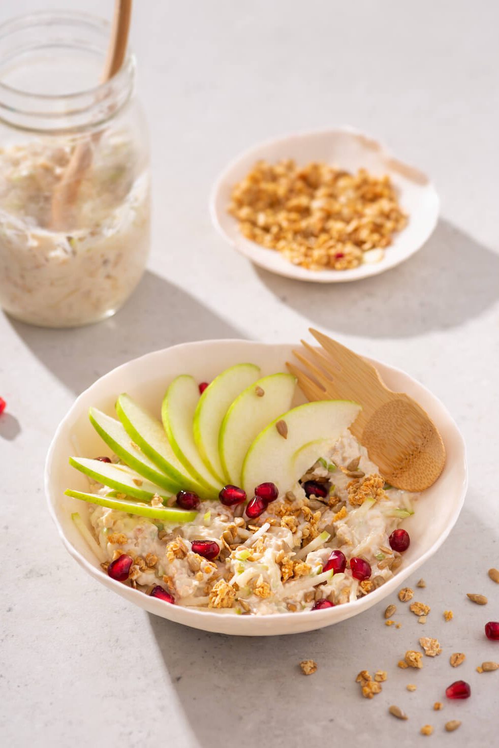 Le bircher se prépare un peu de la même façon qu’un gruau du lendemain, mais tu dois utiliser du granola plutôt que des flocons d’avoine. C’est délicieux et, selon le granola utilisé, tu peux y retrouver des graines, des noix et des fruits séchés!