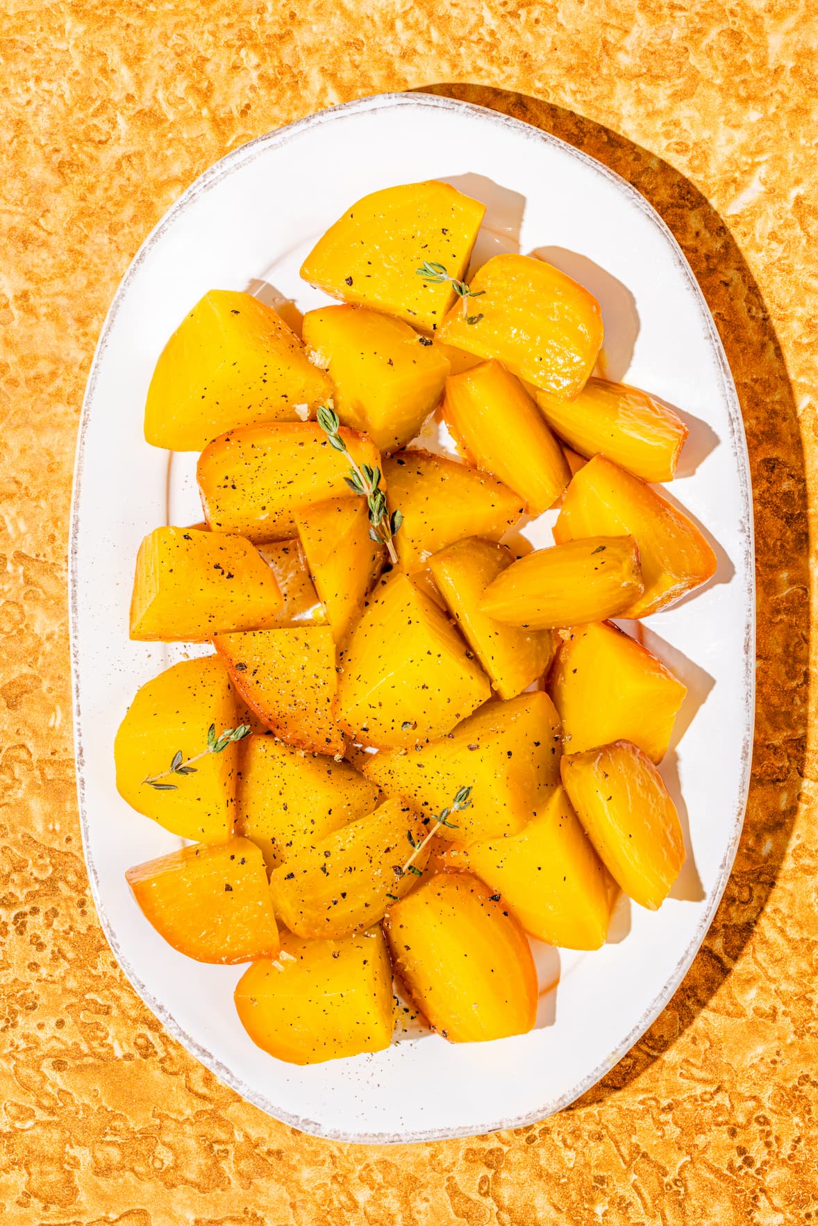 Les betteraves jaunes rôties au four sont un accompagnement coloré et délicieux mettant en valeur la douceur naturelle et la texture tendre de ce légume. En fait, lors de la cuisson, les betteraves jaunes rôties développent une saveur légèrement sucrée avec de douces notes terreuses. Évidemment, la cuisson permet aussi d’attendrir le légume.