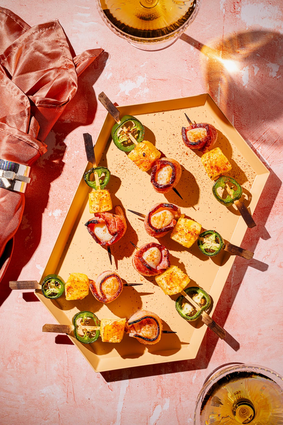 Accueil Recettes Hors-d'oeuvre Brochettes de pétoncles au bacon Close Avantages exclusifs Deviens membre BPT+ pour ajouter une recette en favori et profiter d'une foule d'autres avantages! Deviens membre BPT+ Brochettes de pétoncles au bacon Accès rapides Ingrédients Préparation Commentaires Ingrédients Préparation Commentaires Par : Hubert Cormier, Ph.D., docteur en nutrition Préparation 15 min Cuisson 15 min Réfrigération 1 h Congélation 0 min 12 brochettes Tu peux le faire les yeux fermés! (facile) Accès rapides Ingrédients Préparation Commentaires Ingrédients Préparation Commentaires Restrictions alimentaires Sans arachides Sans gluten Sans lactose Sans noix Sans oeufs Catégories Entrées Hors-d'oeuvre Tu aimes? Tu partages! Brochettes de pétoncles au bacon Prépare la meilleure recette de brochettes de pétoncles au bacon pour servir à tes invités! Les brochettes de pétoncles au bacon sont un délicieux mariage entre la tendreté des pétoncles et la saveur fumée du bacon croustillant. Facile à préparer, cette recette est idéale pour les grillades estivales ou les repas entre amis ou en famille. En plus, en enroulant chaque pétoncle d’une tranche de bacon et en faisant dorer le tout dans le four, tu obtiendras de bonnes petites bouchées de pétoncles qui séduiront le coeur de tous les amoureux de fruits de mer. Savoure la combinaison de jalapeño et d’ananas grillé! Avec cette recette, tu pourras savourer la parfaite harmonie entre le côté piquant du jalapeño et la douceur juteuse des cubes d’ananas grillés. Cette combinaison étonnante vient vraiment créer une explosion de saveurs en bouche. Plus précisément, lorsque l’ananas est grillé, ses sucres naturels se caramélisent et sa saveur sucrée est intensifiée. C’est l’ingrédient idéal pour atténuer l’intensité du jalapeño. Sans aucun doute, ce sera ta nouvelle combinaison d’ingrédients favorite. Tu aimes? Tu partages! BON DANS LA BOUCHE : Tu aimerais avoir d’autres bonnes idées de recettes à servir en entrée? En voici alors quelques-unes! Entrées Oeufs farcis au saumon fumé Entrées Jalapeño poppers (piments jalapeños farcis) Entrées Saucisses cocktail traditionnelles Plats principaux Arayes d’agneau Entrées Bruschetta classique Bonà savoir Fais tremper tes brochettes de bois pour éviter qu'elles ne brûlent! En trempant tes petites brochettes de bois dans l’eau pendant quelques heures, tu éviteras que ces dernières ne brûlent pendant la cuisson. Sinon, pour une alternative plus écologique, opte pour des petites brochettes en métal que tu pourras réutiliser à de nombreuses reprises. Ingrédients Passer en mode cuisine Métrique Impérial Brochettes de pétoncles au bacon Jus d’ananas - ⅔ tasse 160 ml À découvrir! Huile d’olive - 2 c. à soupe 30 ml À découvrir! Sirop d’érable - 2 c. à soupe 30 ml À découvrir! Ail - 1 c. à soupe 15 ml haché À découvrir! Jus de lime - 2 c. à thé 10 ml À découvrir! Pétoncles crus - 12 gros pétoncles 12 gros pétoncles À découvrir! Ananas - 12 gros cubes 12 gros cubes À découvrir! Piments jalapeños - 2 piments 2 piments en tranches d'environ ½ cm À découvrir! Tranches de bacon épaisses - 6 tranches 6 tranches coupées en deux À découvrir! Piment de Cayenne moulu - Au goût Au goût À découvrir! Préparation Passer en mode cuisine Brochettes de pétoncles au bacon Étape 1 Dans un grand bol, mélanger le jus d’ananas avec l’huile, le sirop d’érable, l’ail haché et le jus de lime. Étape 2 Mélanger les pétoncles, les cubes d’ananas et les tranches de jalapeño à la marinade et réfrigérer 1 heure. Étape 3 Préchauffer le four à 450 °F (230 °C) et tapisser une grande plaque de cuisson de papier parchemin. Étape 4 Égoutter les pétoncles, les ananas et les jalapeños et jeter la marinade. Enrouler un morceau de bacon autour de chaque pétoncle. Étape 5 Sur de petites brochettes en bois, enfiler un morceau de jalapeño, un morceau d’ananas et un pétoncle enrobé de bacon par brochette. Étape 6 Disperser les brochettes sur la plaque de cuisson et cuire 15 minutes. Saupoudrer d’une petite quantité de piment de Cayenne et servir immédiatement. Tu veux enregistrer ou imprimer cette recette? Entre ton adresse et nous t’enverrons cette recette par courriel. En prime, tu recevras d’autres succulentes recettes toutes les semaines! Envoyer Tu aimes? Tu partages! Bonà savoir Questions fréquentes Est-il possible d'utiliser des ananas en cubes en conserve pour cette recette? L’utilisation d’ananas en cubes pour cette recette n’est pas recommandée. En fait, les cubes d’ananas en conserve sont souvent trop petits et ils risquent de se briser et de tomber de la brochette. Il est alors conseillé d’utiliser des cubes d’ananas frais. Par quoi remplacer le sirop d'érable dans cette recette? Tu peux facilement substituer le sirop d’érable de cette recette par la même quantité de miel.
