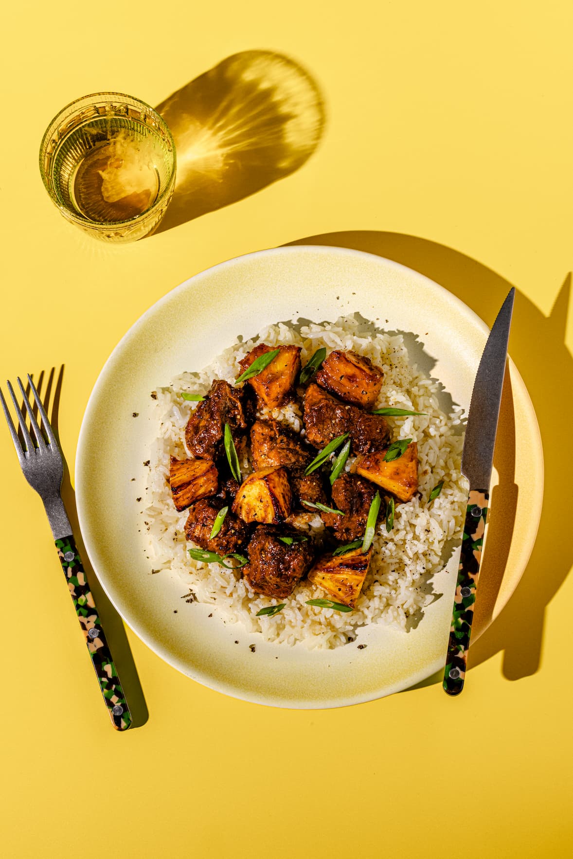 Accueil Recettes Mijotés Porc adobo à l’ananas Close Avantages exclusifs Deviens membre BPT+ pour ajouter une recette en favori et profiter d'une foule d'autres avantages! Deviens membre BPT+ Porc adobo à l’ananas Accès rapides Ingrédients Préparation Commentaires Ingrédients Préparation Commentaires Par : Hubert Cormier, Ph.D., docteur en nutrition Préparation 20 min Cuisson 1h40 Réfrigération 0 min Congélation 0 min 4 à 6 portions Tu peux le faire les yeux fermés! (facile) Accès rapides Ingrédients Préparation Commentaires Ingrédients Préparation Commentaires Restrictions alimentaires Sans gluten Sans lactose Sans oeufs Sans sucre ajouté Catégories Mijotés Plats principaux Tu aimes? Tu partages! Porc adobo à l’ananas Découvre la meilleure recette de porc adobo à l’ananas! Le porc adobo à l’ananas est un plat mariant les saveurs salées, sucrées et acidulées pour créer un repas riche, savoureux et décadent. Accompagnée de riz blanc ou de légumes sautés, cette recette réconfortante se démarque assurément au niveau du mélange de saveurs et de textures. Effectivement, les gros morceaux juteux d’ananas grillés surprendront par leur saveur sucrée tandis que les tendres morceaux de porc enrobés de sauce salée complèteront à merveille la saveur du plat. Savais-tu qu’il est possible de râper le gingembre frais? Effectivement, avec une râpe fine, il est possible de râper le gingembre frais rapidement et efficacement! Cela est même beaucoup plus rapide que de hacher le gingembre au couteau. D’ailleurs, pour t’aider à râper le gingembre, conserve ta racine de gingembre au congélateur. Une fois bien congelé, le gingembre se râpe encore plus facilement. Tu aimes? Tu partages! Les bons achats Recette tirée du livre : Bon pour toi - 85 idées pour le souper Voir dans la boutique Ajouter au panier BON DANS LA BOUCHE : Tu aimerais avoir d’autres belles idées pour tes prochains soupers? Voici alors quelques recettes gagnantes! Plats principaux Côtelettes de porc à la mijoteuse (érable et cari) Plats principaux Filets de porc miel et ail à la mijoteuse Plats principaux Médaillons de porc en brochettes Plats principaux Tagliatelles avec boulettes de porc à la suédoise Plats principaux Porc effiloché à la mijoteuse Bonà savoir Ajuste le côté épicé du plat selon tes goûts! À la base, cette recette de porc adobo à l’ananas n’est pas très épicée. Effectivement, dans les ingrédients de la recette, tu retrouveras une faible quantité de flocons de piment broyés. Or, si tu aimes tes plats bien relevés, tu peux facilement doubler la quantité de flocons de piment broyé de cette recette. Autrement, tu pourrais ajouter un peu de sauce de type sriracha lors du service ou bien en mélanger une petite quantité dans la recette de sauce. Ingrédients Passer en mode cuisine Métrique Impérial Porc adobo à l'ananas Ananas - 1 moyen 1 moyen paré en cubes de 1 ½ po (environ 4 cm) À découvrir! Huile végétale - 1 c. à soupe 15 ml À découvrir! Épaule de porc (ou flanc de porc) - 2,2 lb (1 kg) 2,2 lb (1 kg) en cubes de 2 po (5 cm) À découvrir! Sel - ½ c. à thé 2,5 ml À découvrir! Poivre - ½ c. à thé 2,5 ml À découvrir! Huile d’arachide - ¼ tasse 60 ml À découvrir! Oignon jaune - 1 moyen 1 moyen haché À découvrir! Gousses d’ail - 6 gousses 6 gousses hachées À découvrir! Gingembre frais - 1 c. à soupe 15 ml finement haché À découvrir! Vinaigre de riz - ¾ tasse 180 ml À découvrir! Sauce soya - ½ tasse 125 ml À découvrir! Eau - ½ tasse 125 ml À découvrir! Sauce d’huîtres - 3 c. à soupe 45 ml À découvrir! Poivre noir du moulin - 1 c. à thé 5 ml À découvrir! Feuilles de laurier - 4 feuilles 4 feuilles À découvrir! Flocons de piment broyés - ½ c. à thé 2,5 ml À découvrir! Garniture Oignon vert - 1 tige 1 tige ciselé À découvrir! Préparation Passer en mode cuisine Porc adobo à l'ananas Étape 1 Couper la moitié des ananas en plus petits cubes. Étape 2 Dans une moyenne casserole, à feu doux, chauffer l’huile végétale et cuire les plus petits cubes d’ananas environ 20 minutes ou jusqu’à ce qu’ils soient bien tendres. Au robot mélangeur, broyer la préparation. Réserver. Étape 3 Éponger le surplus de sang sur la viande à l’aide de papier absorbant et saler et poivrer les cubes de porc sur toutes leurs surfaces. Étape 4 Dans une grande casserole, chauffer la moitié de l’huile d’arachide à feu moyen élevé. Saisir ensuite les cubes de porc sur toutes leurs surfaces. Au besoin, saisir la moitié de la viande à la fois. Réserver dans une grande assiette. Étape 5 Toujours dans la même casserole, à feu moyen doux, cuire l’oignon et les gousses d’ail environ 5 minutes. Ajouter le gingembre et poursuivre la cuisson 1 minute. Étape 6 Ajouter les cubes de porc, la purée d’ananas et les autres ingrédients de la recette à la casserole (à l’exception des gros cubes d’ananas). Porter à ébullition, couvrir et laisser mijoter 45 minutes à feu doux. Étape 7 Pendant ce temps, dans une grande poêle, à feu moyen vif, chauffer le reste de l’huile d’arachide et cuire les gros morceaux d’ananas jusqu’à ce qu’ils soient caramélisés. Réserver. Étape 8 Découvrir la casserole de porc, augmenter la température de cuisson à feu moyen et chauffer 20 minutes ou jusqu’à ce que la sauce soit bien épaisse. Étape 9 Retirer les feuilles de laurier et incorporer délicatement les morceaux d’ananas caramélisés. Garnir d’oignons verts et servir. Tu veux enregistrer ou imprimer cette recette? Entre ton adresse et nous t’enverrons cette recette par courriel. En prime, tu recevras d’autres succulentes recettes toutes les semaines! Envoyer Tu aimes? Tu partages! Bonà savoir Question fréquente Comment savoir si l’ananas est mûr? Un ananas mûr a une couleur jaune ou dorée uniforme à sa base. Également, le fruit mûr